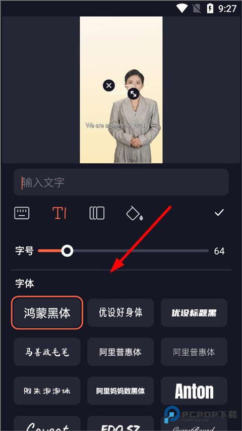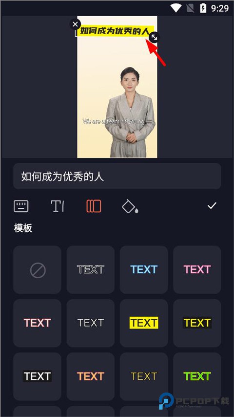 6、打开文字版块,用户可修改模板文案,选择文字模板、颜色,调整文字大小位置;