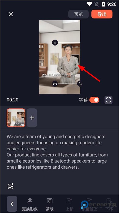 4、选择数字人后,用户可拖动数字人模板并调整数字人位置大小;