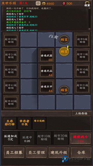 3、白天需要经营超市获取材料,升级超市、招募不同职业的幸存者、探索未知领域;