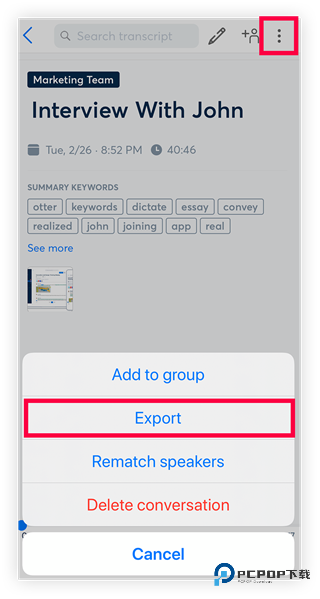 点击详细信息屏幕右上角显示的图标以显示“导出”菜单。 语音和文本数据都可以导出。 文本数据可以导出为 TXT 文件、剪贴板(复制到剪贴板)、DOCX 文件、PDF 文件或 SRT 文件。 DOCX,PDF和SRT文件仅适用于高级用户。