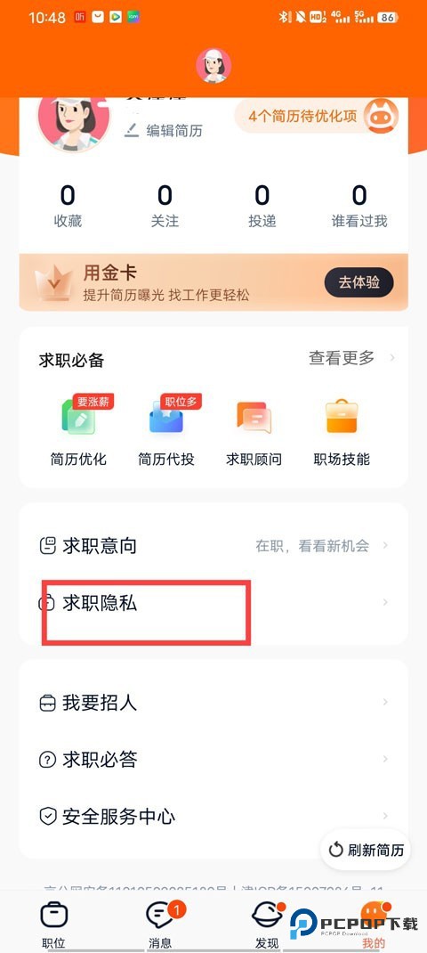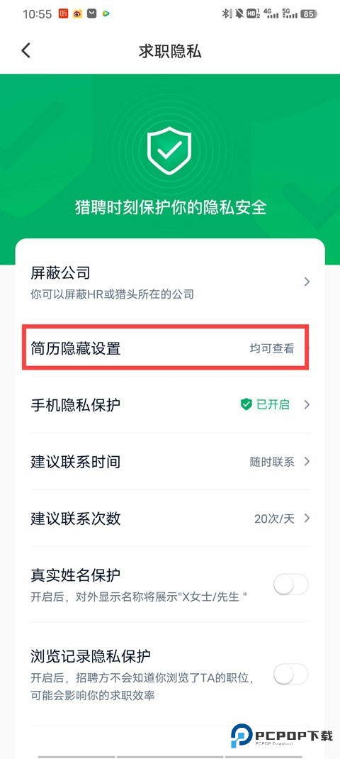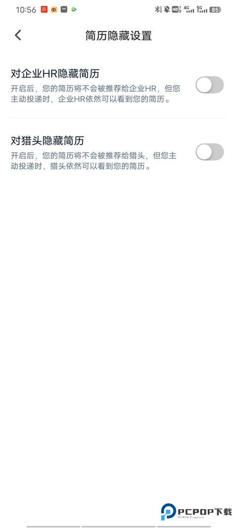3、在简历隐私设置中,我们可以看到对企业和猎头隐藏简历,我们选择打开隐藏简历