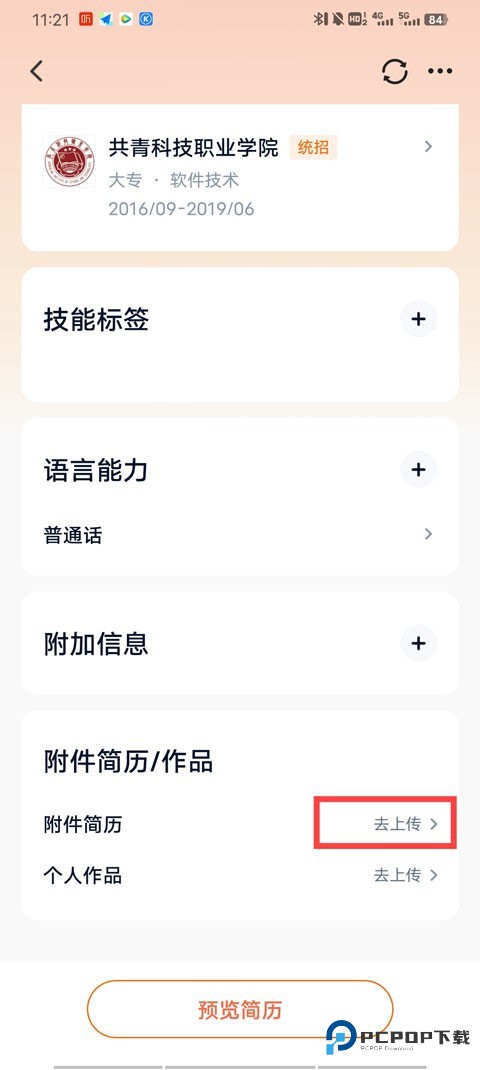 2、浏览自己的简历,然后往下拉,点击附件简历右侧的去上传