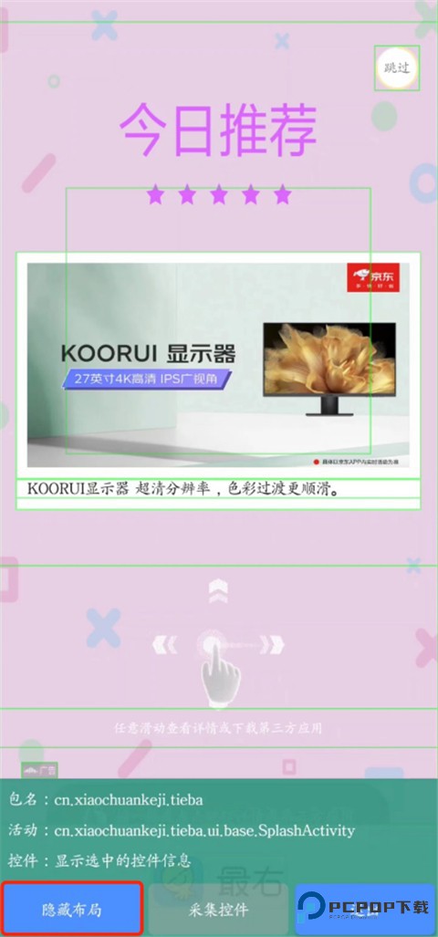 5、返回桌面,打开目标应用,这里以最右为例:打开应用后,出现广告,此时先点击左下角显示布局按钮,此时会将该界面的布局绘制出来,每个控件都会有绿色的线条包裹。