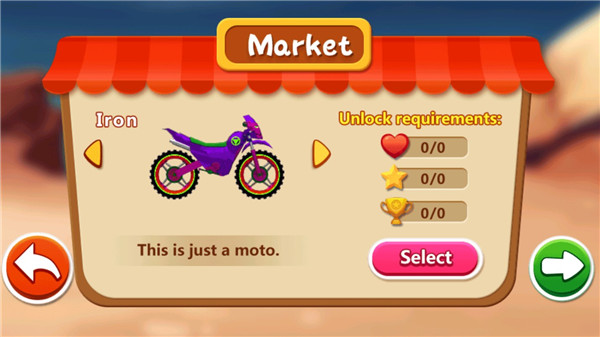 特技摩托赛将允许玩家在游戏中的赛道上充分施展才艺,表演一系列炫酷的特技来证明自己优异的摩托车驾驶技术。游戏提供了数量丰富的关卡与多款性能各异的摩托车,不同摩托车的属性将会影响其在赛道上的发挥,同时每一辆摩托车都有其适配的地图场景,玩家可按需选择,以便于更轻松地完成关卡。