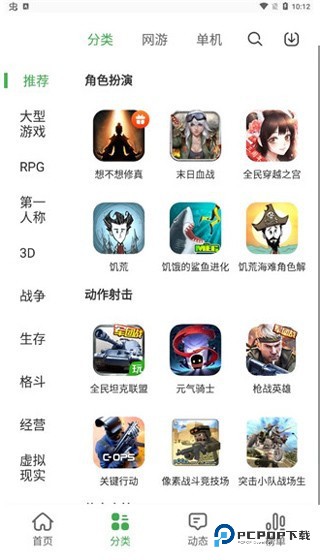 2、在分类这里,有大型、RPG、第一人称、战争、生存、经营等多种类型供玩家选择;