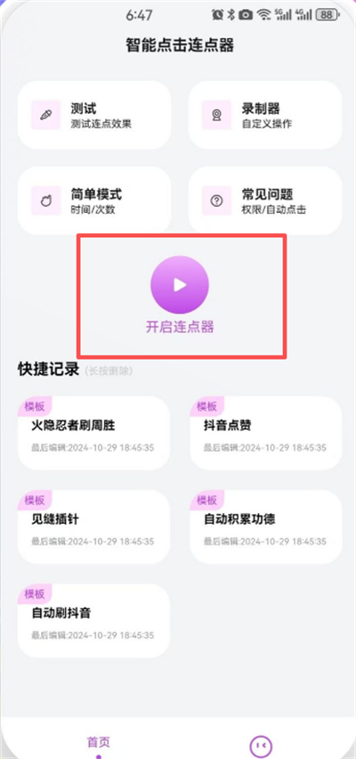 在智能点击连点器app中,除了基本的自动点击功能之外,软件还支持非常多其他的实用功能,像是录制视频、自动刷抖音等等。
