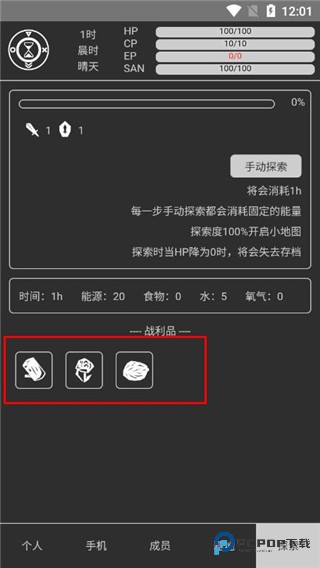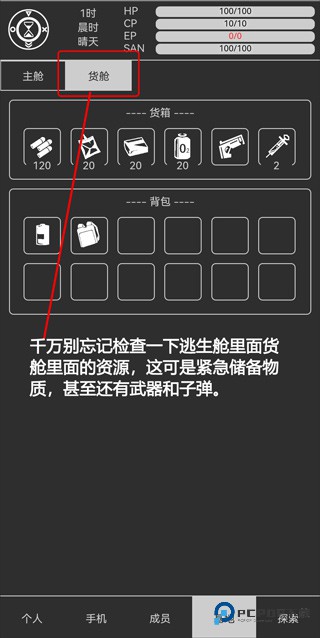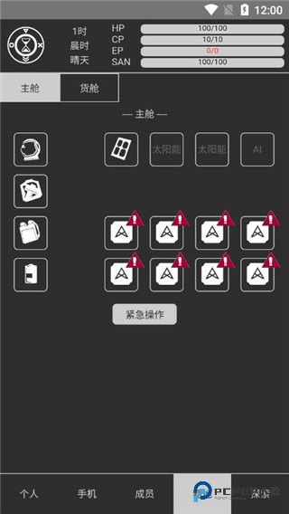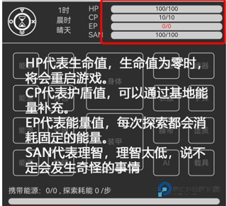 3、HP代表生命值,生命值为零时,将会重启游戏;CP代表护盾值,可以通过基地能量补充;EP代表能量值,每次探索都会消耗固定的能量;SAN代表理智,理智太低,说不定会发生奇怪的事情