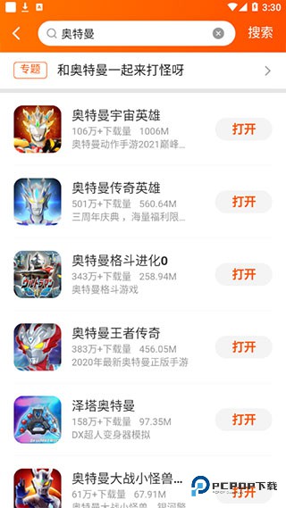 2、点击上方框架,输入想要搜索的游戏名称并点击搜索,页面就会显示出,想要的游戏或与之相关的游戏,例如奥特曼。