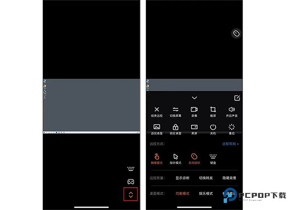 4、进入到远控桌面后,可以通过远控工具栏进行一些列的远程操作,点击远控界面右下角【<>】图标打开远控工具栏。