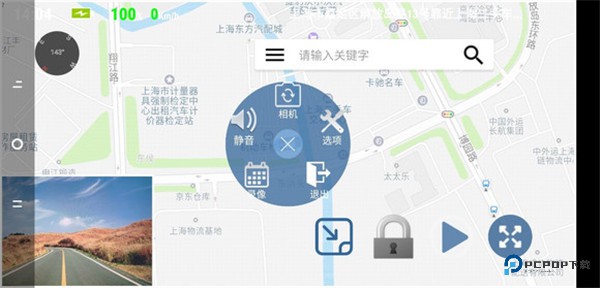 2、右下的常用功能按钮从左往右依次是最小化APP成为悬浮窗运行、锁定当前录像、录制/停止和主菜单。点击左下角的地图区域的时候,可以变换到下图所示的导航界面;