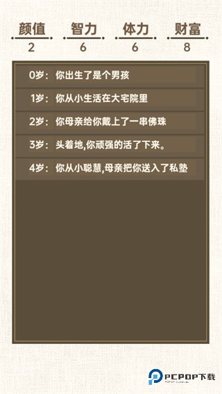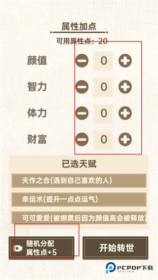 加点分为智力,体力,财富,长相,我们可以根据自己的想法来进行加点,不过上面两个加点还是希望能够慎重考虑并且相互结合一下,毕竟未来的方向也会因为你的这些选择而发生重大的转变。随后就是我们的出生,一岁一岁的长大,并在每个时间点发生千奇百怪的事情,直至我们的转世过来的人生走向尽头。