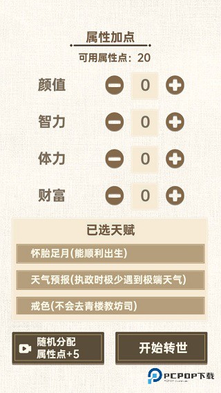 在这里你并不是一个转世直接当皇帝的人,而是一切重新开始,从一个刚刚出生的婴儿开始走出自己的新旅程。不同于其他的重生,我们在进入游戏的开始可以选择为自己能力加点,加点的方向有很多,从十条当中进行选择,再下来就是对自己的个人属性的加点。