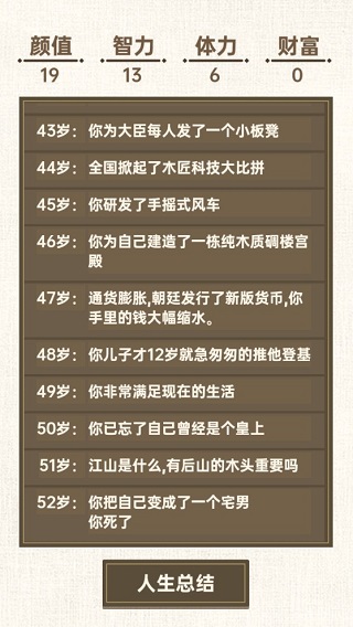 转世皇帝模拟器以高随机性的人生模拟玩法为卖点,玩家在游戏中仅能决定自己先天获得的天赋以及自己的四项属性加点(没有幸运呜呜呜。),并在一切皆有可能发生的高随机性事件中见证一系列精彩纷呈或者诡异到让人摸不着头脑的人生,简单的玩法带来的是无穷的乐趣,在轻松愉快的氛围中还可充分放松心情。
