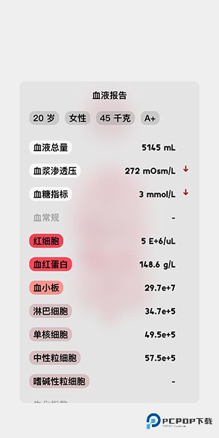 9、点击左下角的红色血滴图标,会显示该人体模型的具体血液报告,里面包含了各项专业指标。