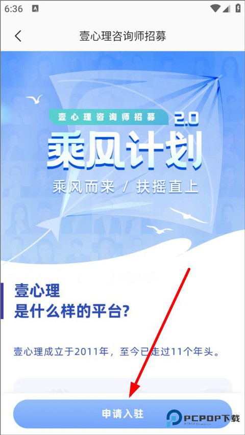 4、打开咨询师招募页面,用户可了解相关信息,点击申请入驻。