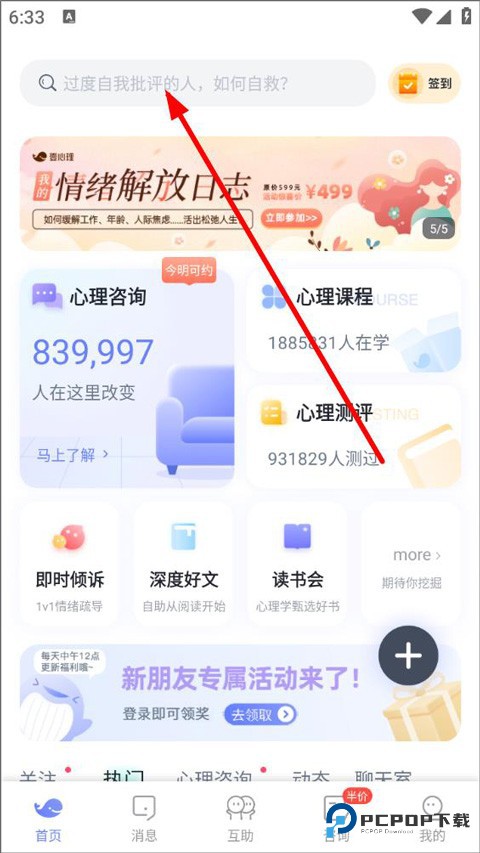 1、打开app,登录进入首页,首页有心理咨询、心理课程、即时倾诉、读书会等,用户在搜索框输入咨询师搜索。