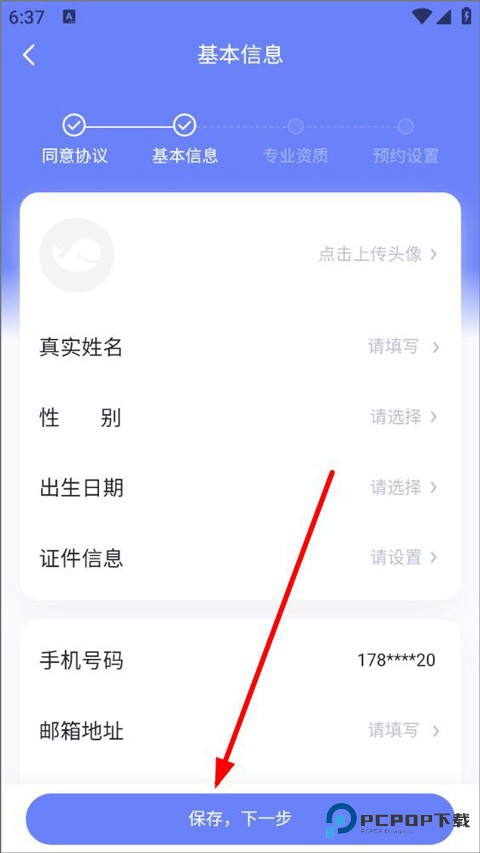 5、填写壹心理咨询师入驻申请,阅读入驻服务协议-填写基本信息(姓名、性别、出生日期、证件信息等),保存点击下一步。