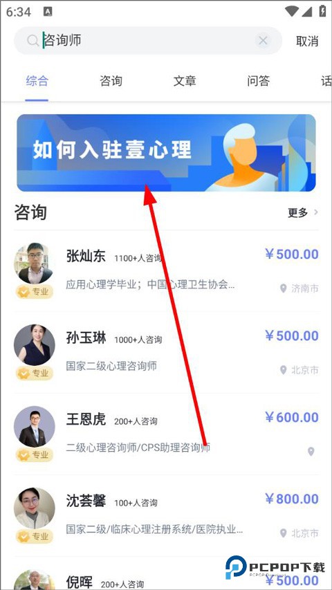 2、搜索后,用户可查看文章、问答以及相关咨询师信息,点击如何入驻壹心理。