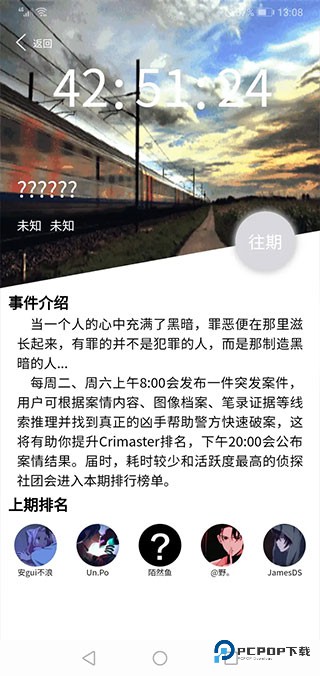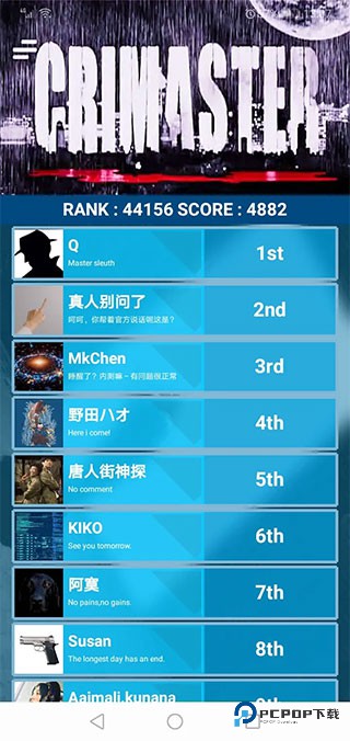 这里可以说是还原了唐人街探里的排行榜,里面的榜一就是我们熟悉的Q,但是据说是官方账号并非真人,具体到底是不是,crimaster官方也没有回应,但是榜二榜三据我的观察应该都是真实玩家,而其他的玩家ID,像唐人街侦探,阿默(林默?)等等唐人街探案宇宙中的知名侦探,是真人还是官方账号也没人知道。但是在这里你却可以看到自己的排位。PS:由于玩家数量的增加,刷分的玩家也有不少,所以排位会很不稳定(中下游分数,大概5000分以后的玩家),所以想要拿到靠前的榜位还是有点难的,特别是针对新手。