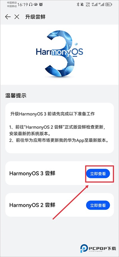 2、进入后点击HarmonyOS 3尝鲜右边的立即查看;