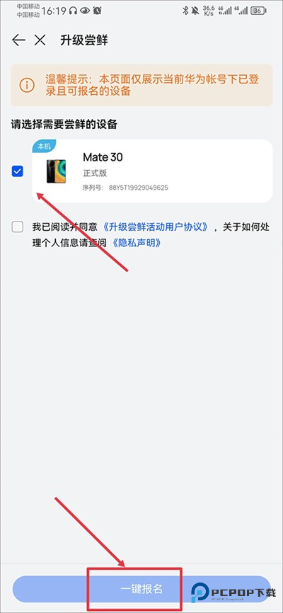 4、然后在升级尝鲜界面中选择需要尝鲜的设备,并点击一键报名;