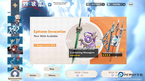 1、打开原神愿望模拟器中文版,进入游戏主界面,游戏模拟了原神单抽和十连两种抽卡方式,