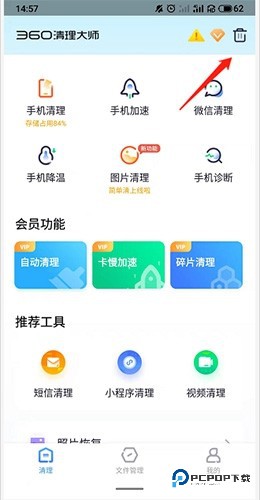3、点击360清理大师首页,设有手机清理、加速等功能,还有会员功能与短信清理等推荐工具。