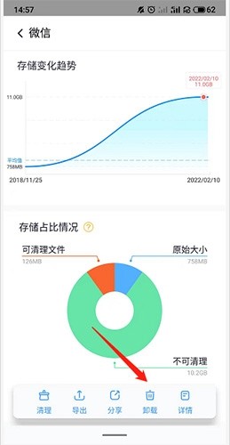 2、点击微信存储页面展示微信存储变化趋势与占比情况,提供清理、导出等操作选项,助力管理微信存储。