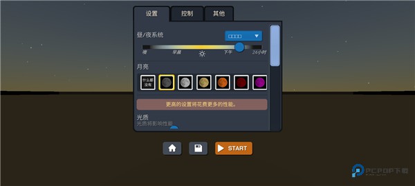 3、紧接着我们需要调整地图中的月亮的颜色、亮度等,设置好后,点击start,如下图;