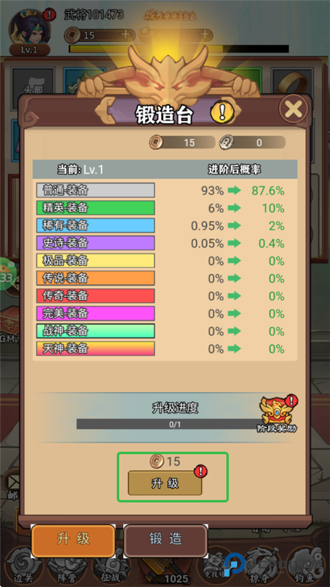 5、玩家可给锻造台升级,提升获得稀有装备的概率。