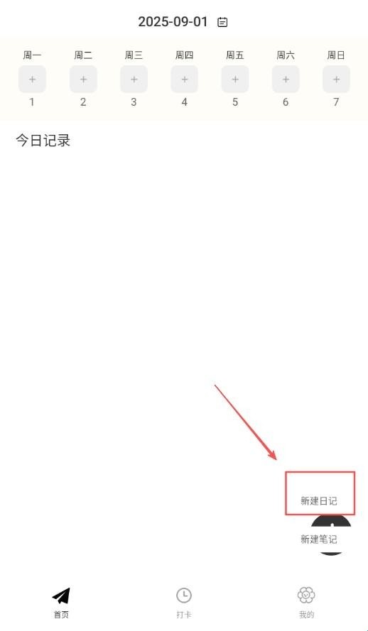 2、点击加号后,在弹出的功能选项里找到新建日记相关的选项,点击该选项进入日记编辑界面。