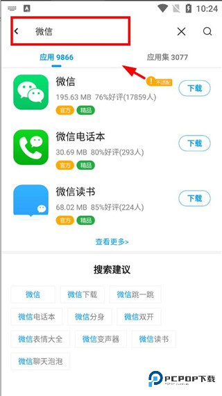2、进入软件后,可直接点击屏幕上方搜索框输入你想要找旧版本的软件,小编以“微信为例”如下图所示