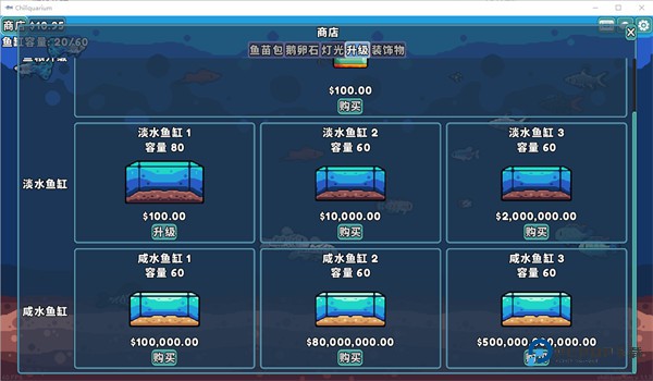2、商店的列表中还有各种养鱼所需要的物品,例如鱼苗包、鹅卵石、灯光、升级、装饰物等都可以进行购买;