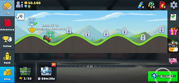 1、下载进入登山越野竞速游戏,游戏中拥有大量的关卡等你挑战,选择你的关卡点击"START"开始游戏;