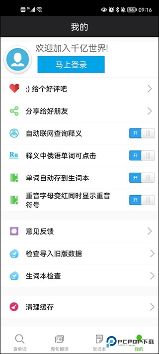 4、另外,在"我的”界面中用户可以手动设置联网查询释义,还可以对释义中的俄语单词进行点击,更是可以设置自动保存生词本。