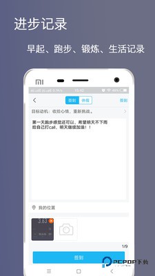 3、你可以先制定自己的目标和计划,然后通过跑步打卡,减肥打卡,瑜伽打卡,运动打卡等等打卡签到的形式,进行目标管理。虽然没有keep、多锐运动那样的健身宝典健身课程,也没有乐运动、乐心运动、悦跑圈那种计步器功能,但我们以另一种方式让你更加专心于完成自己的目标,那就是打卡签到。通过每天的打卡来约束自己的行为,并且我们还有签到提醒,比如跑步提醒,健身提醒,运动提醒,瑜伽提醒等,让你在不想完成目标的时候有个不能放弃的理由。
