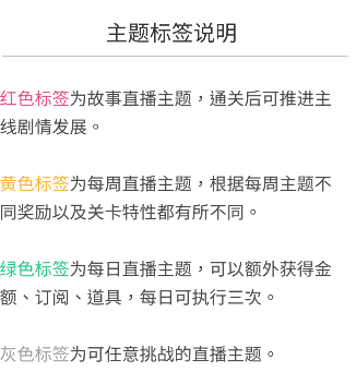红色标签对应着主线剧情,新晋主播们将在欧伏来王国逐步体验成长的快乐,完成一次次挑战历练。完成主线会获得丰厚的奖励,在到达某事件后可以解锁出支线直播。