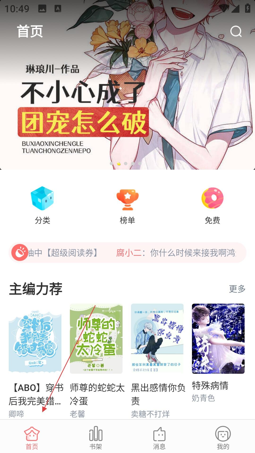 3、进入主界面,看轮播推荐、分类导航,通过主编力荐找优质小说,或用搜索、榜单,发现内容。