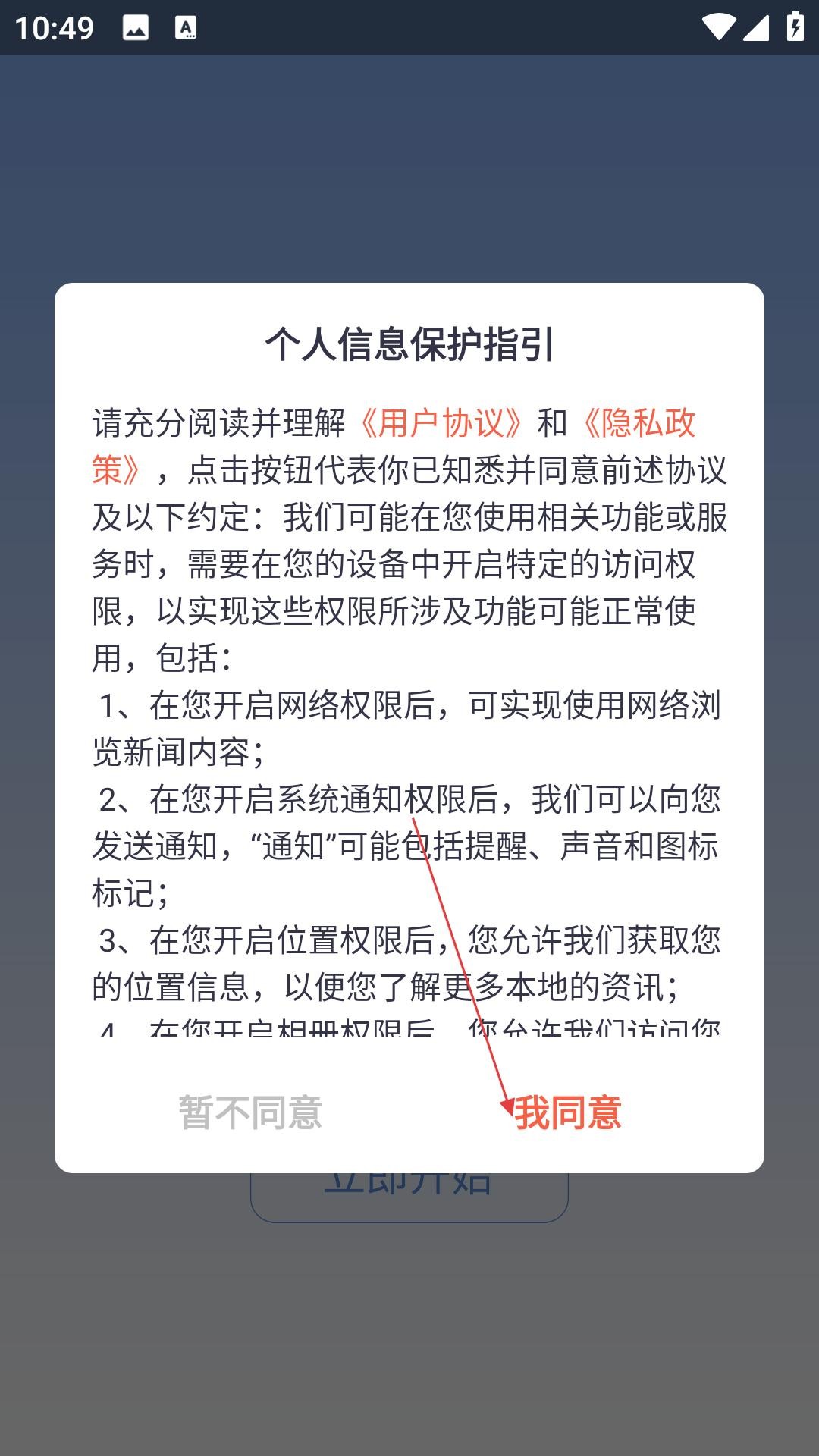 1、下载安装完成后进入,需在用户协议和隐私政策界面点击同意,接受相关条款后才能进入应用。