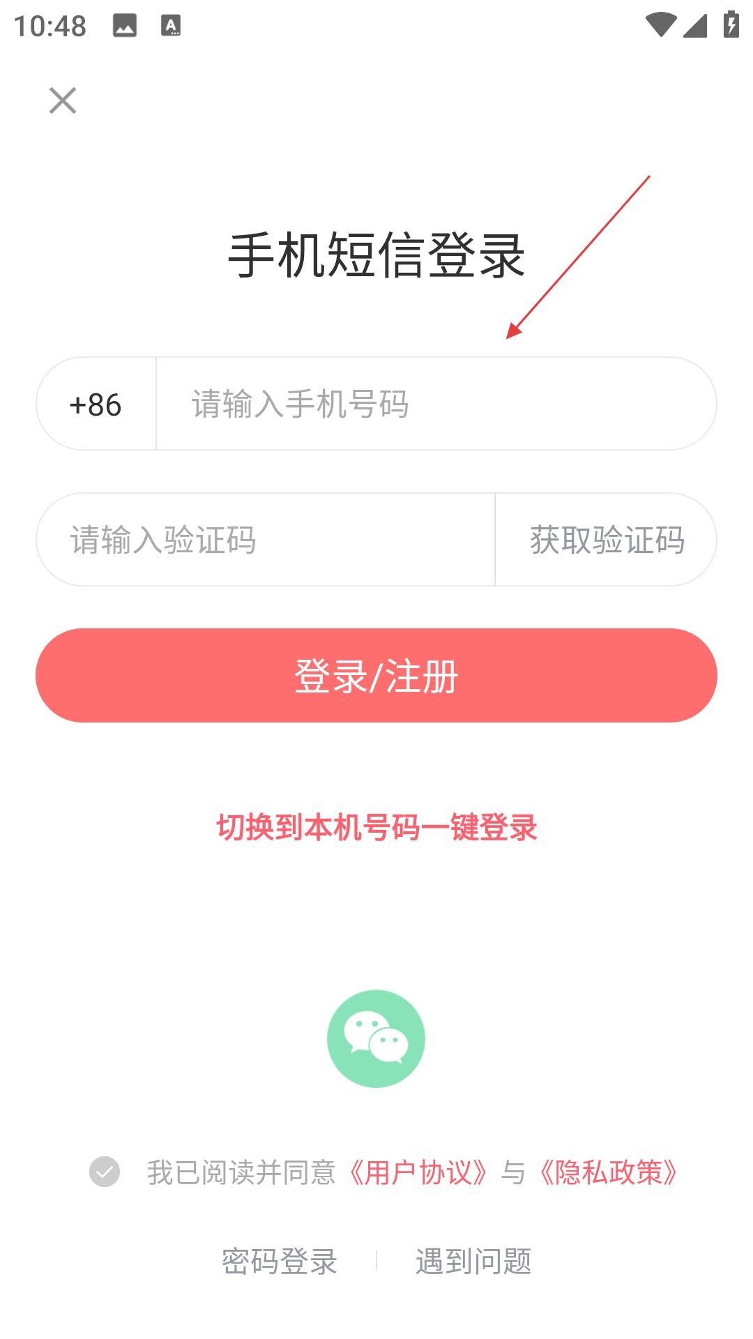2、进入登录页,用手机号验证码方式,或切换本机号、微信登录,完成后,使用APP功能。