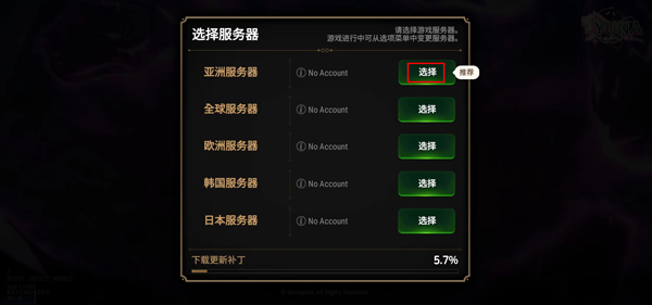2、登录好之后,最后肯定是选择服务器进入游戏了,这个时候我们选择亚洲服务器,当然想体验亚服肯定选择亚服,不过你想体验其他服务器的话,也可以选择其他的