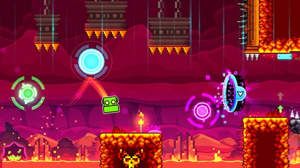 游戏中,玩家可以收集分散在主关卡隐蔽或者挑战区域的金币解锁附加关卡,成绩以及更多人物图标,使游戏更加用户化。人物外观的变化会影响用户自定义关卡,也会解锁单独成就。进度条在屏幕顶端用来显示玩家在关卡中的进程。玩家可以按照自己的意愿调整或去除进度条。游戏中一些物品的颜色是根据人物图标的颜色变化而变化的,甚至有些背景颜色也是依人物变化而变化的。关卡一开始障碍物布置得很明显,但随着难度的增大,一些机关会分散在装饰,灯光,旋转甚至是隐藏障碍物中。这个并不是游戏预期的特色;随着游戏的更新,更多关卡和方块加入,新关卡也综合了新加入的元素提高难度。