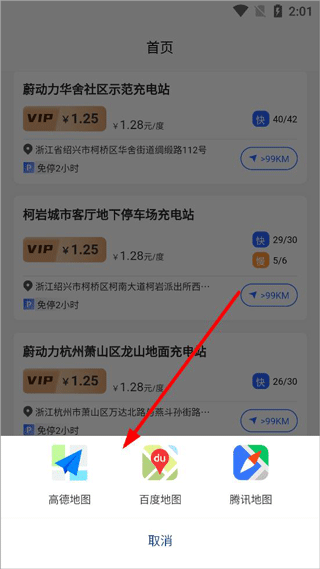 3、打开地图导航,驱车到充电桩位置后,打开扫码充电即可。