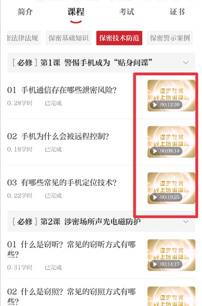 2、进入培训课程界面中时,在每个视频的右下角都带有视频走过时长,显示1-2分钟的直接将进度条拖到最后就行