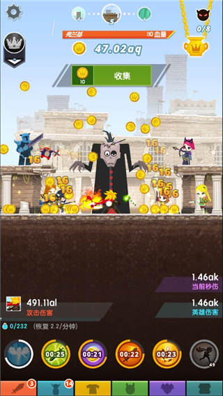 除此之外,进入游戏玩一会就会发现底下的菜单栏从原来的4个变成了现在的6个,除了之前的主角栏、雇用英雄栏、神器栏和商店之外,这次还多了装备和宠物两栏,别小看这两个多出来的,这让游戏的成长系统多了两个也能让游戏变得更耐玩,装备可以改变主角的装扮也可以使自己变得更强大。