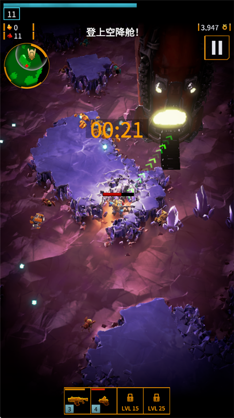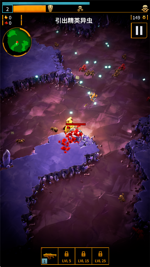 深岩银河幸存者手游支持玩家同时装备4把武器,游戏内无需手动开火,武器会根据设定自动攻击。玩家将通过消灭敌人、挖矿获得经验值进行升级,可以从三个随机强化方向中选择,可以提升武器性能、提升暴击率、增加移速等。