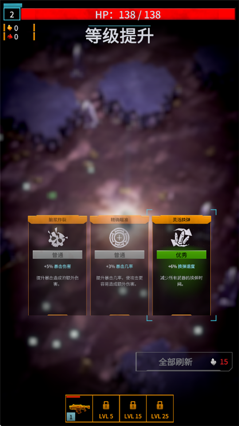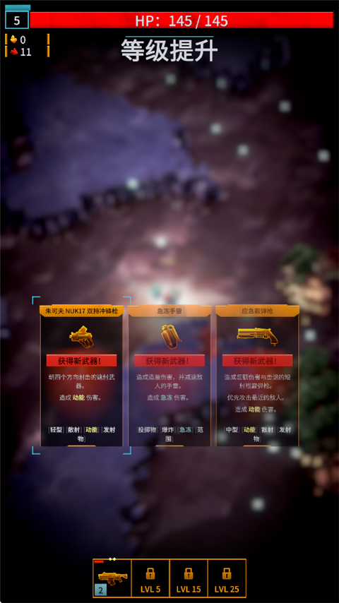 3、玩家升级时可自由强化武器的伤害、射程等属性,或是提升角色的移速、暴击率等增益。