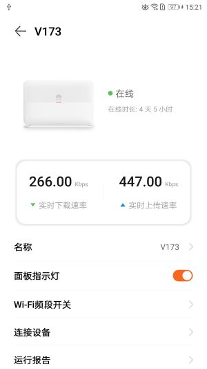 4、点击某个网关设备可查看当前上传下载速率及运行时间,还能开启或关闭Wi-Fi频段、设置连接设备等。
