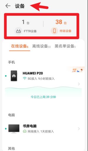 3、进入“设备”页面,可以查看当前所有联网设备的状态,包括在线、离线及是否被列入黑名单。