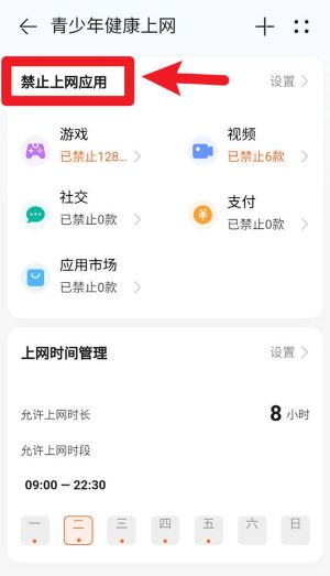 2、在“青少年健康上网”页面中,选择想要禁止的应用类型,并设定允许的上网时长与具体时间段。